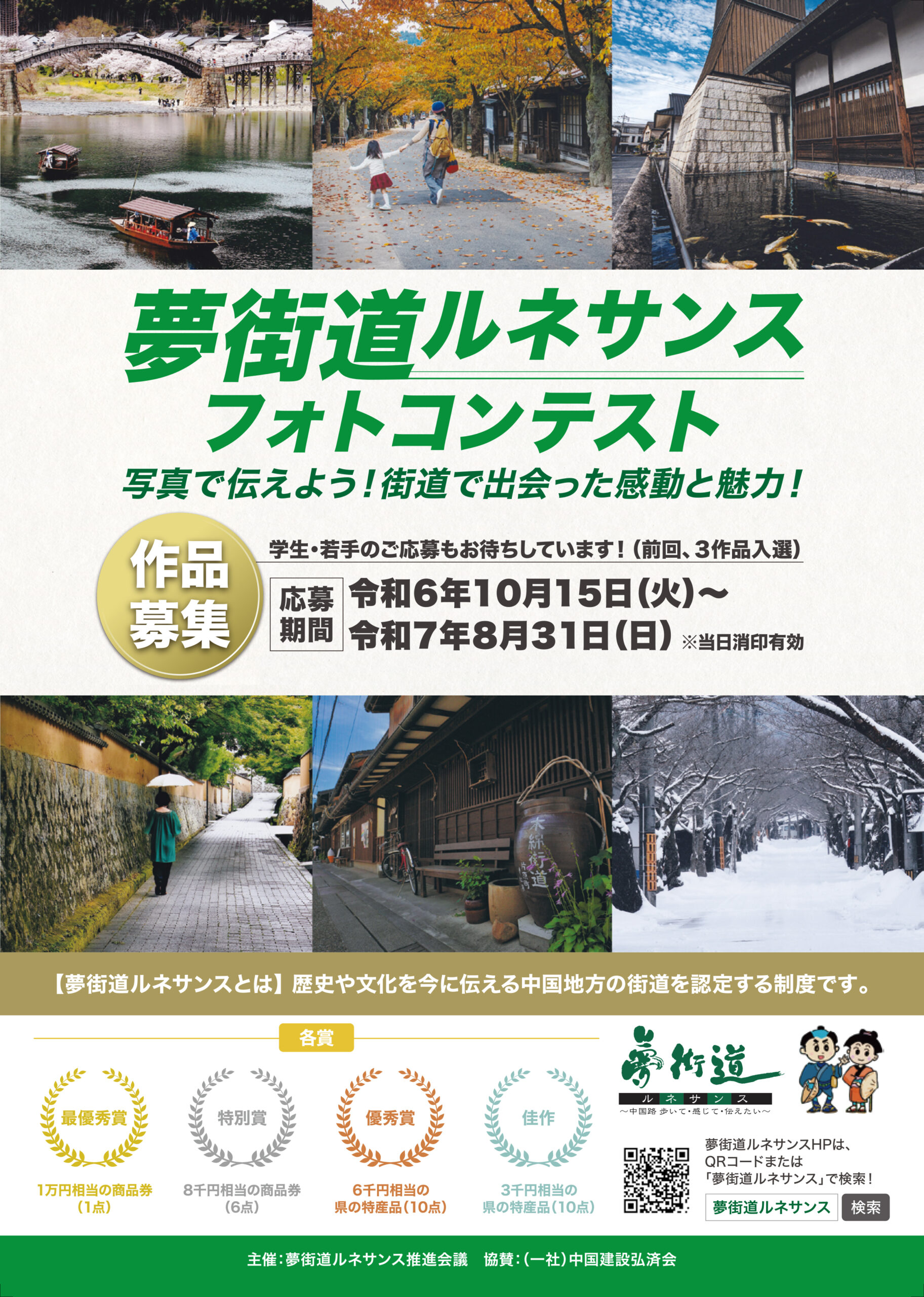 賞の区分や応募期間など、重要情報は視認性を重視した整理されたレイアウトで表示し、ポスターとしての訴求力とチラシとしての情報性を両立。街道の価値を広く発信し、幅広い世代の参加を促すクリエイティブに仕上げました。